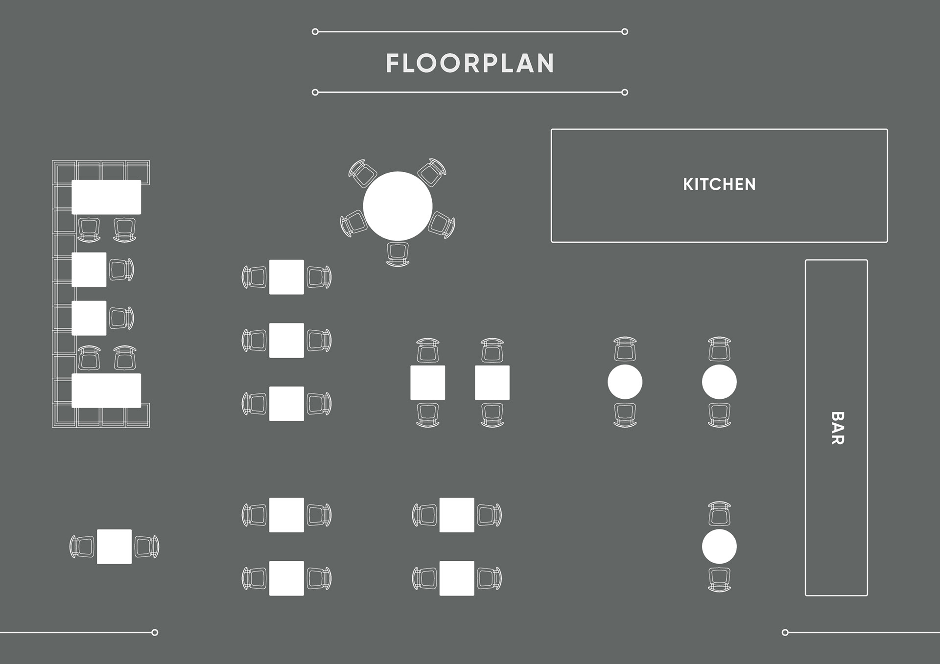 Online brochure for London restaurant, Park's Edge Bar and Kitchen, to promote their private events and off-site catering. The brochure utilises their pre-existing branding and design elements pulled from other materials. A custom-made floor plan is also included alongside menus and case studies.